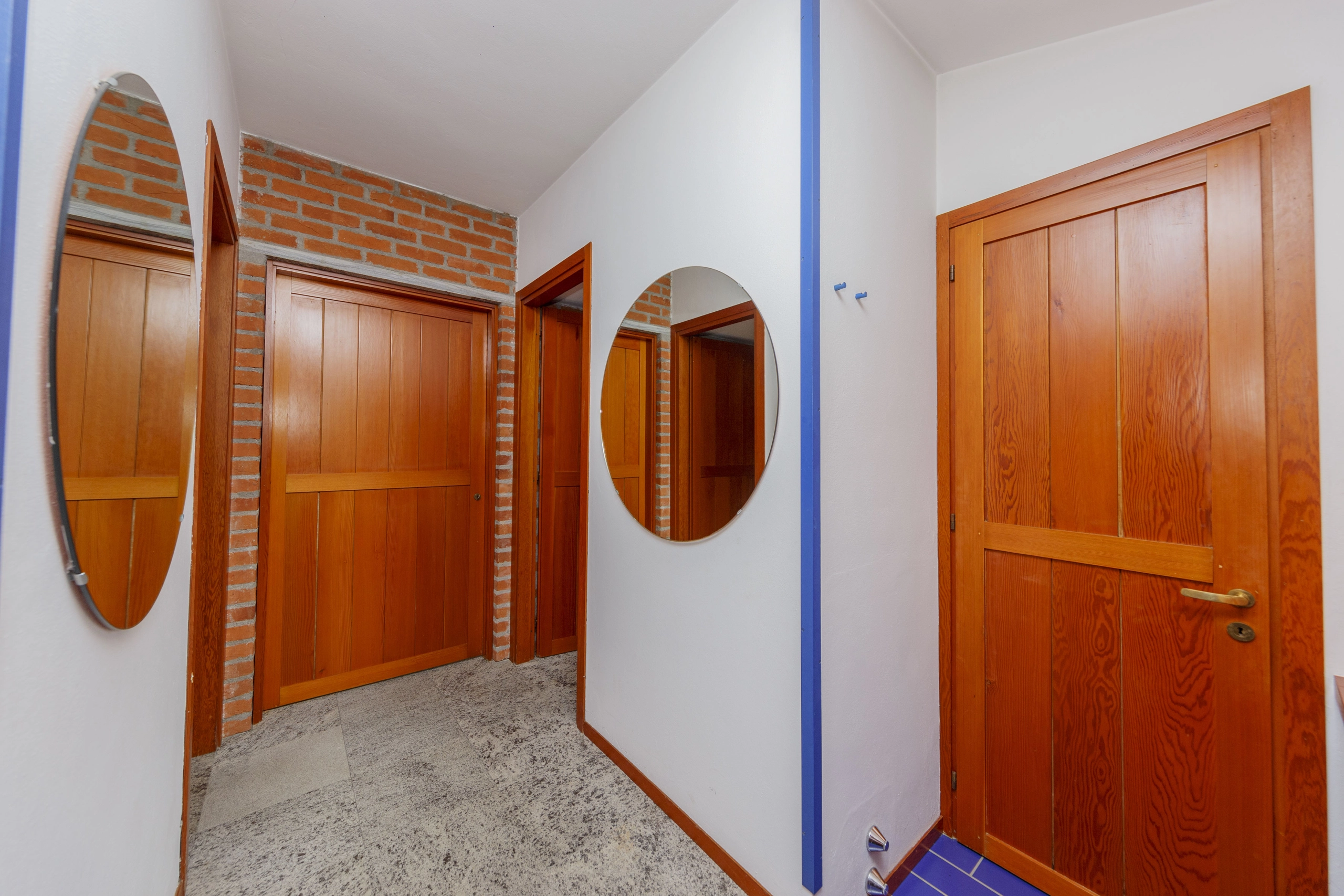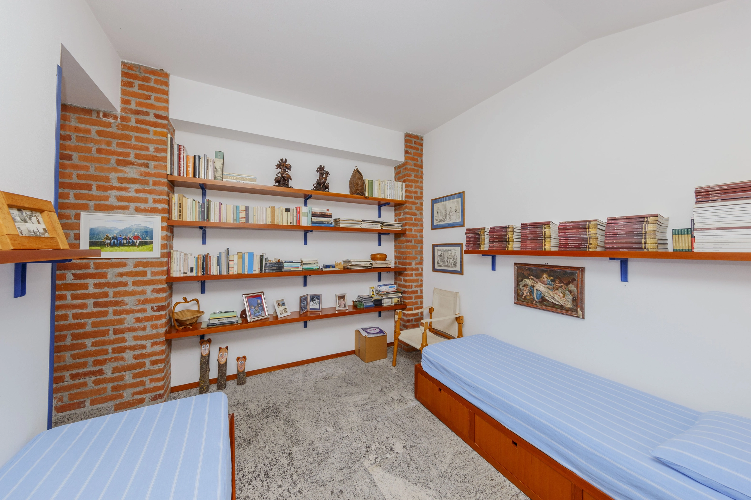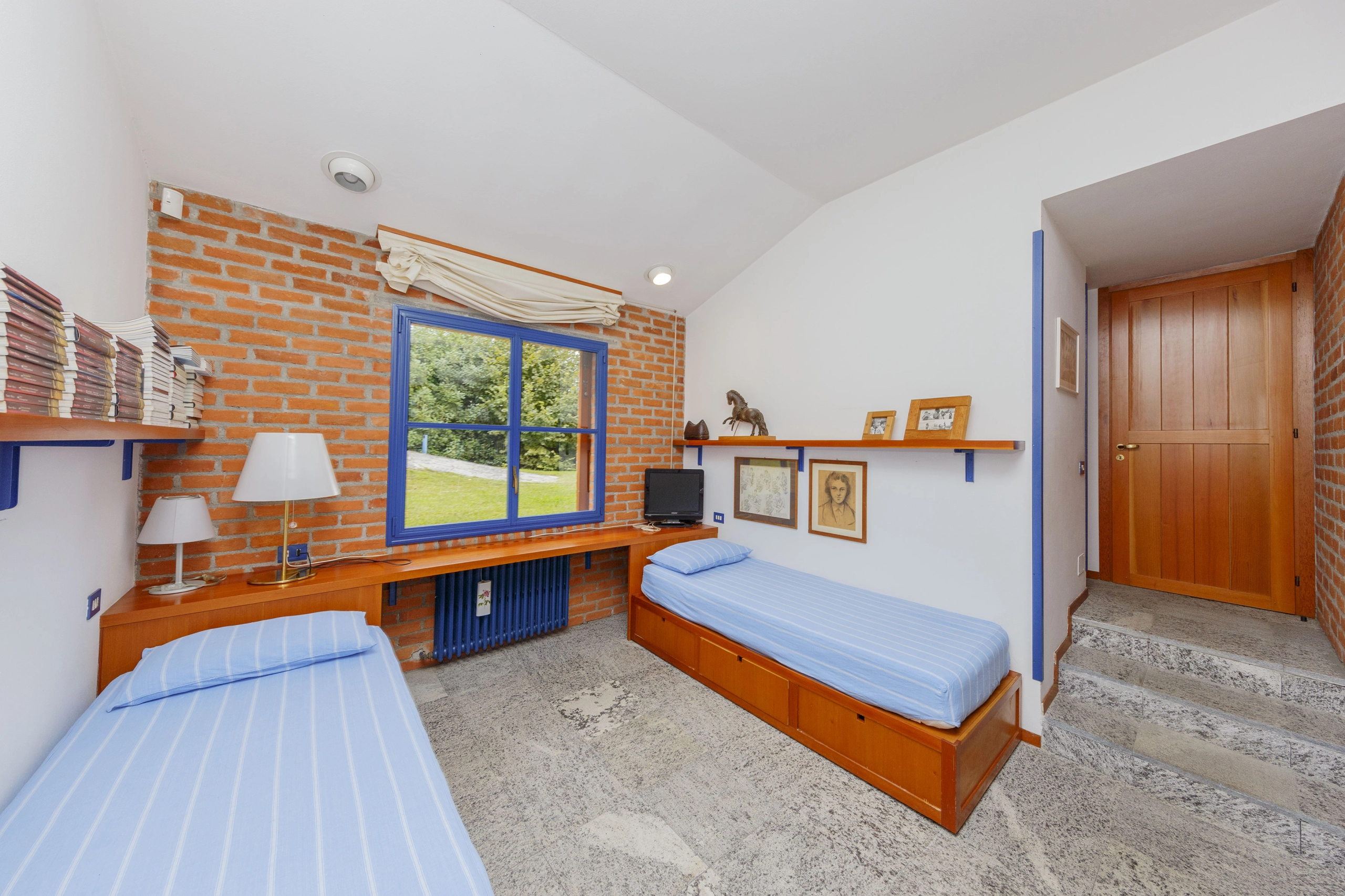 At the heart of the home, the living room boasts a fireplace that serves as a dramatic focal point, artfully framing sweeping views of Lake Maggiore and the majestic Angera Castle. The entire design is anchored in a central symmetry, a key feature that informs both the architectural layout and the interior décor, instilling a sense of balance and flow.